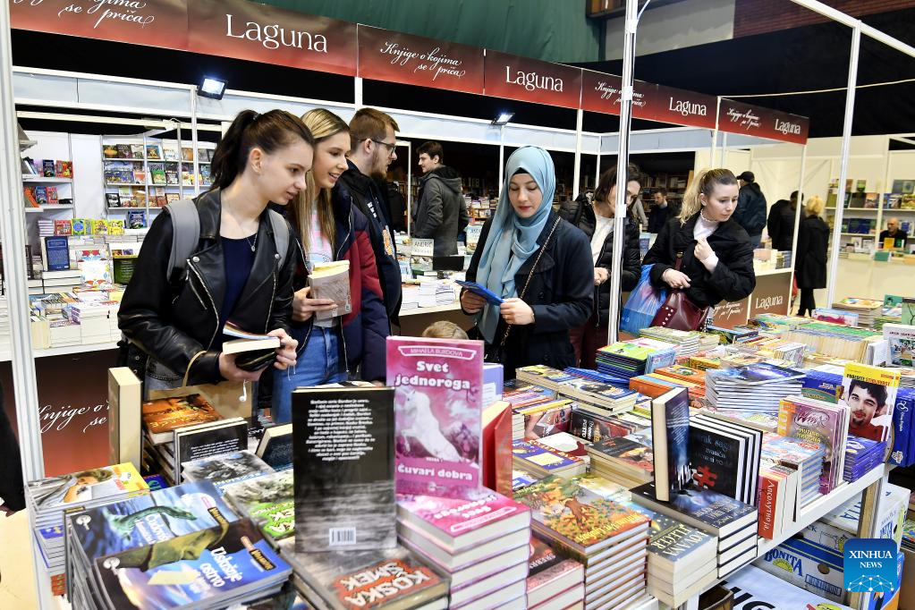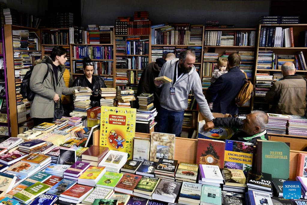 People select books at the International Book Fair in Sarajevo, Bosnia and Herzegovina (BiH), on April 20, 2022. The International Book Fair was opened in Sarajevo on Wednesday. (Photo by Nedim Grabovica/Xinhua)