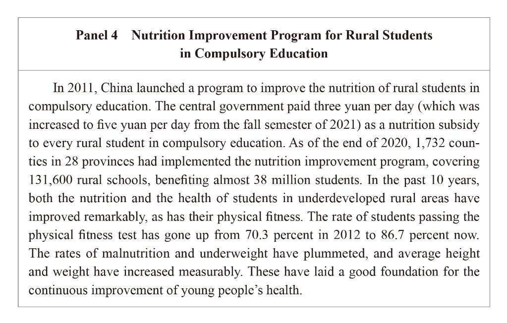 Improved physical health. In schools, as the class hours for physical education continue to increase, students study academic courses in class, and engage in physical activities on the playground. More than 37 million rural students receiving compulsory education have benefited from the student nutrition improvement program, and their physical health has markedly improved. In 2018, 92 percent of students aged between 14 and 19 passed the physical fitness test, and the proportion of those rated good or excellent increased substantially.