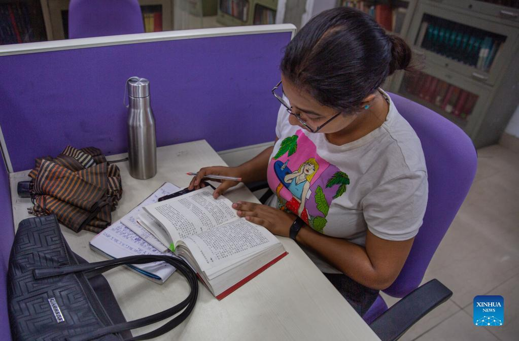 An Indian student of Chinese language course reads a book on Chinese literature in a library of the Center for Chinese and South East Asian Studies at Jawaharlal Nehru University (JNU) on the United Nations Chinese Language Day, in New Delhi, India, April 20, 2022. The UN Chinese Language Day is observed on April 20 every year since 2010, celebrating the language's contribution to the world while encouraging more people to learn it. (Photo by Javed Dar/Xinhua)