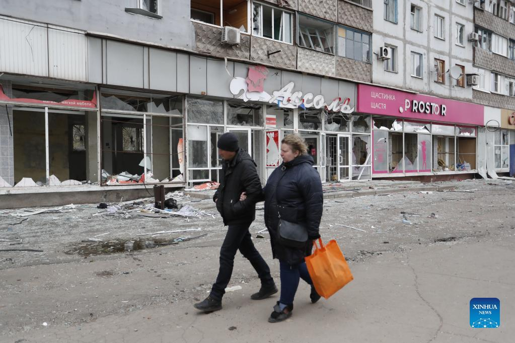 Residents walk past damaged buildings in Mariupol on April 19, 2022. Ukraine and Russia have reached a preliminary agreement on establishing a humanitarian corridor to evacuate women, children and the elderly from the embattled city of Mariupol, Ukrainian Deputy Prime Minister Iryna Vereshchuk said on Wednesday. (Photo by Victor/Xinhua)