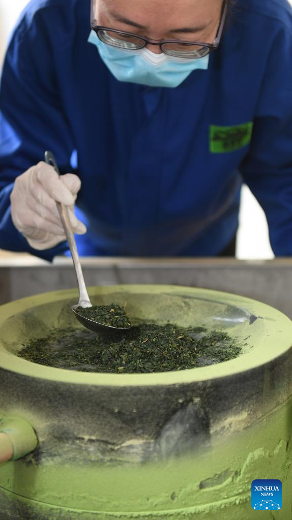 A worker makes matcha in Shaoxing, east China's Zhejiang Province, April 20, 2022. Spring tea harvest season has started at a matcha producing base in Fusheng Township of Shaoxing.