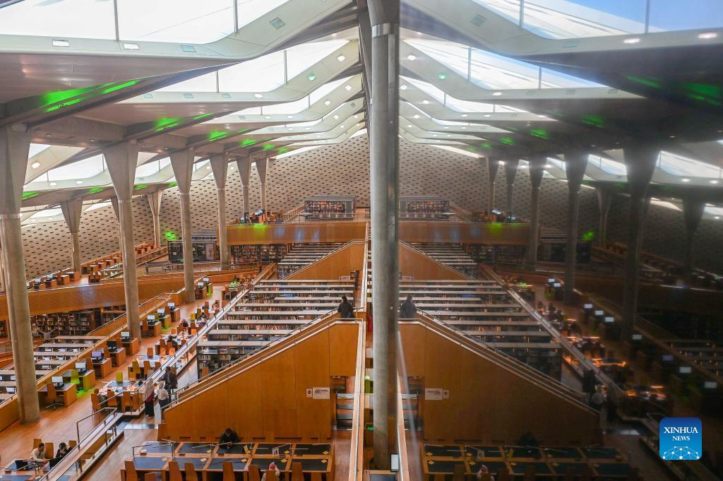 Photo shows a view of the interior of the Bibliotheca Alexandrina in Alexandria, Egypt on April 19, 2022. Bibliotheca Alexandrina, a massive unique library and cultural symbol of the Egyptian Mediterranean coastal city of Alexandria which was founded by King Alexander the Great some 2,300 years ago, features a disc-shaped exterior and 11 internal levels, all under one glistening, tilting roof. The iconic library was inaugurated in 2002 as a revival of the original ancient Library of Alexandria, which was one of the largest and most significant libraries worldwide before being destroyed by a fire a few decades BC. (Photo by Ahmed Draz/Xinhua)