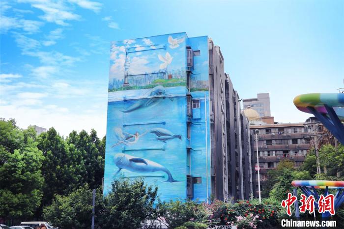 Photo shows a painting featuring Yangtze finless porpoises that was created by Zhang Hao on the wall of a building. (Photo courtesy of the interviewee)