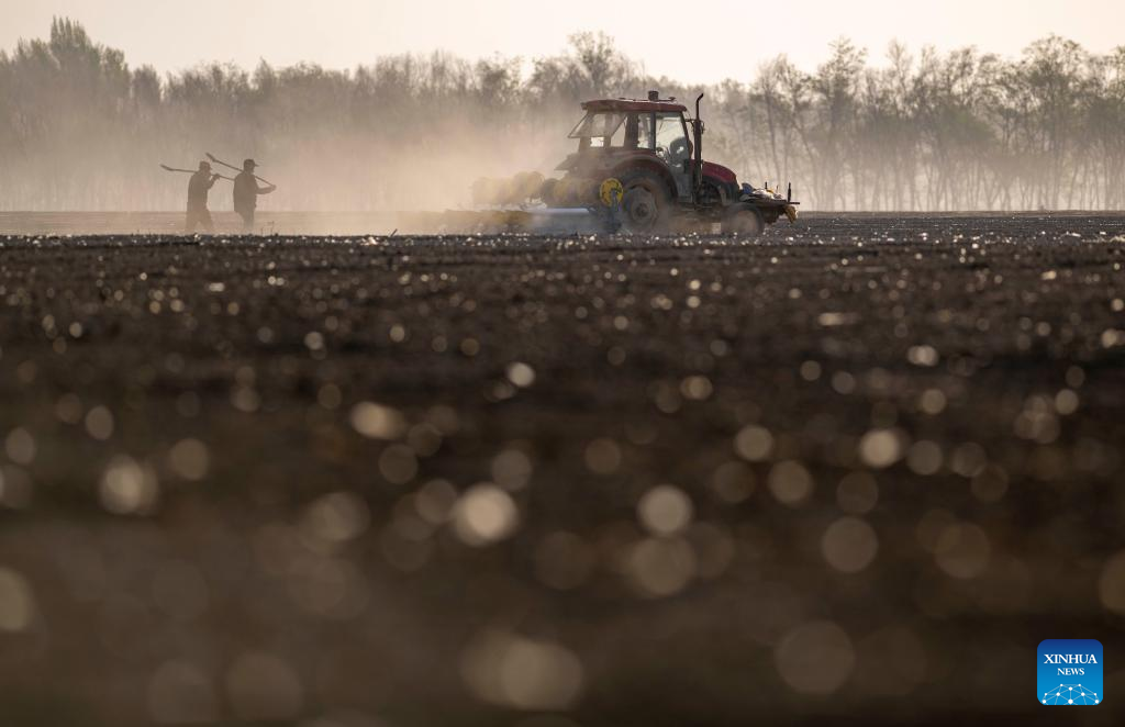 A seeding machine guided by the BeiDou Navigation Satellite System works in a cotton field in Shawan City, northwest China's Xinjiang Uygur Autonomous Region, April 18, 2022.