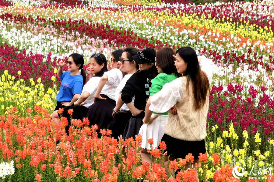Visitors pose for photos in a flower field in Yubang village, Shaxian district, Sanming city, southeast China’s Fujian Province. (People’s Daily Online/Lin Xiaoli)