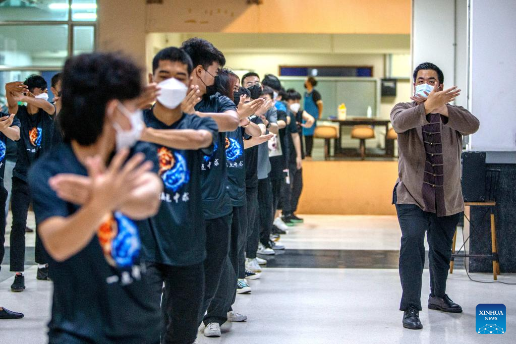 Ekarat Janrathitikarn (1st R), Thai dean of the Maritime Silk Road Confucius Institute, teaches Chinese Tai Chi during a class at Dhurakij Pundit University in Bangkok, Thailand, April 21, 2022. A one-month Tai Chi course is held by Maritime Silk Road Confucius Institute in Dhurakij Pundit University, which attracts more than 40 students to take part in. (Xinhua/Wang Teng)