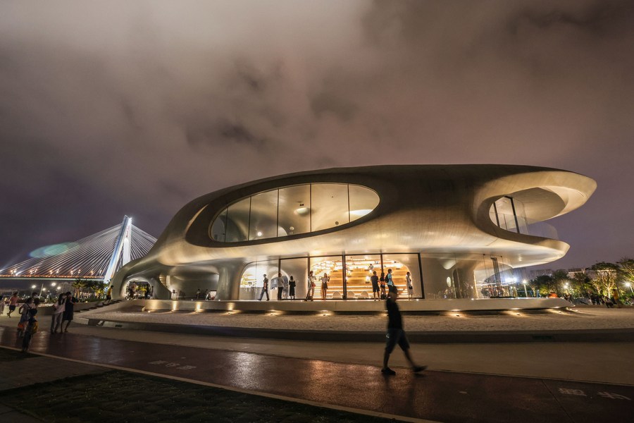 Photo taken on April 16, 2022 shows the Wormhole Library in the Haikou Bay in Haikou, south China's Hainan Province. (Xinhua/Zhang Liyun)
