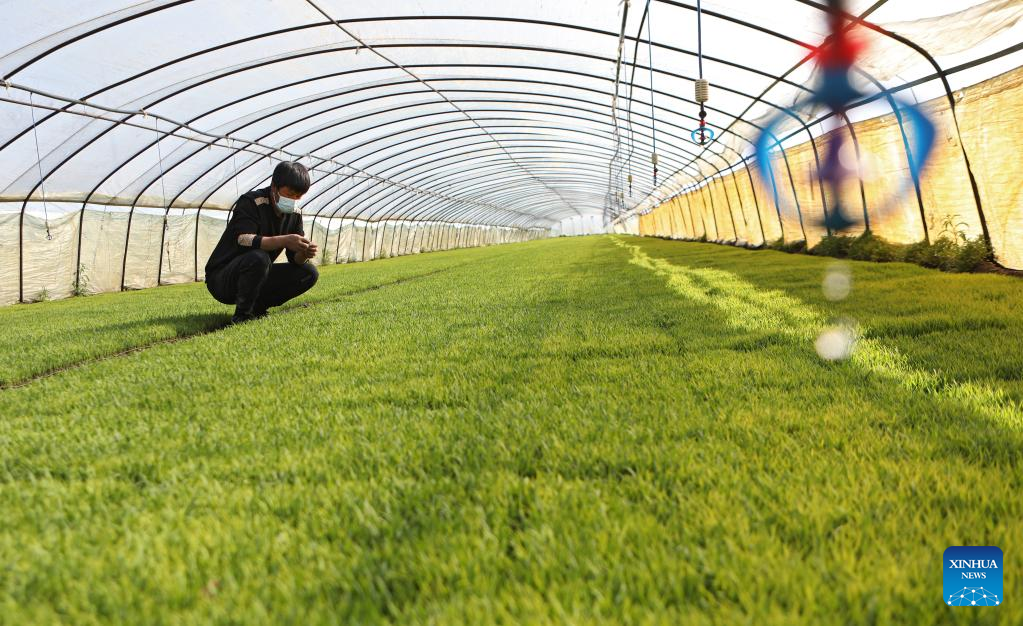 A worker checks rice seedlings at a seedling raising base in Chenjiafang Village of Gaolifang Township in Tai'an County, northeast China's Liaoning Province, April 22, 2022. (Xinhua/Wang Yijie)