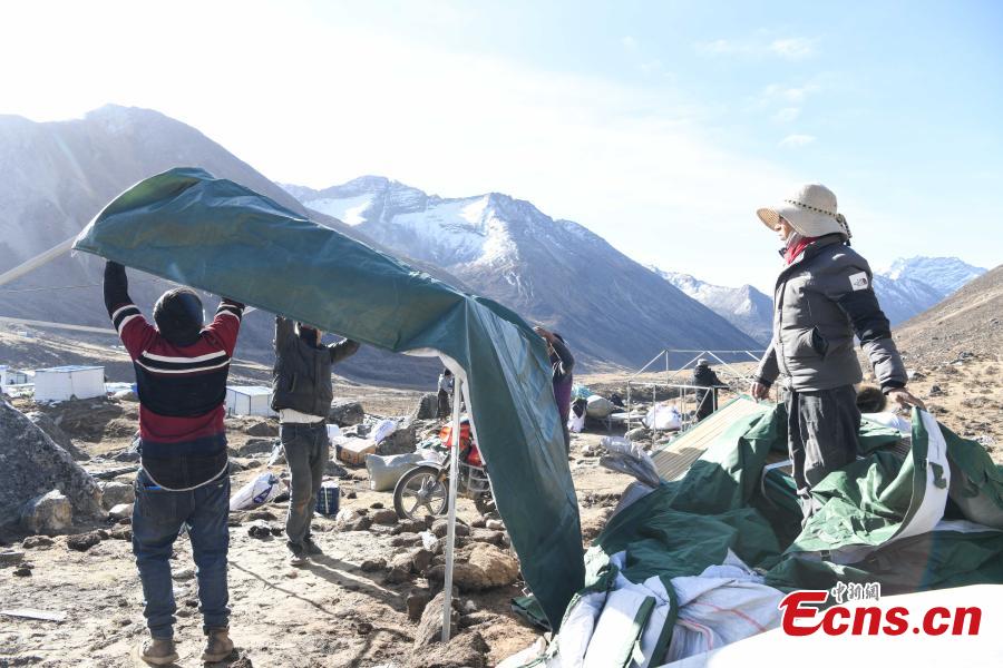 Villagers set up tents at a collecting site in Gyaca County, southwest China's Tibet Autonomous Region, April 20 2022. Caterpillar fungus has entered the annual picking season in Tibet. (Photo/China News Service)