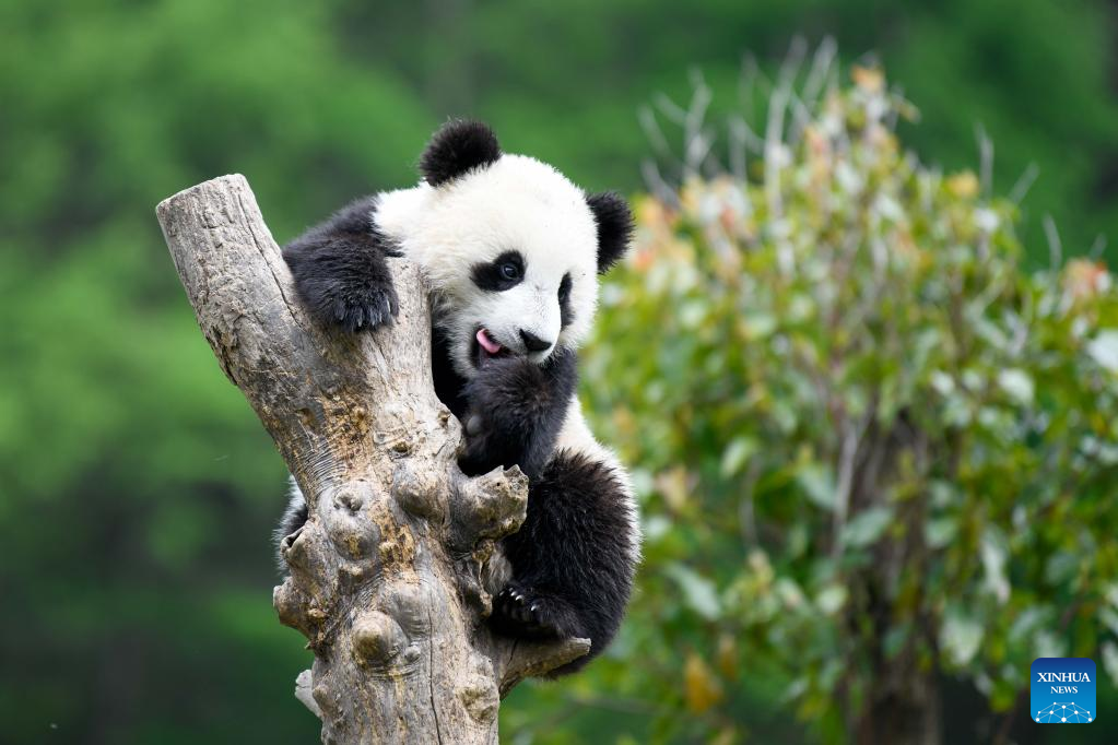 A giant panda climbs a tree at Shenshuping base of China Conservation and Research Center for Giant Pandas in Wolong National Nature Reserve, southwest China's Sichuan Province, April 24, 2022. (Xinhua/Xu Bingjie)
