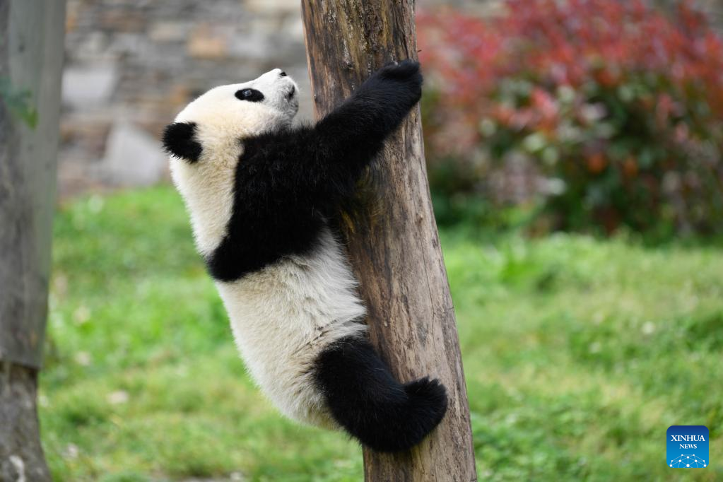 A giant panda climbs a trunk at Shenshuping base of China Conservation and Research Center for Giant Pandas in Wolong National Nature Reserve, southwest China's Sichuan Province, April 24, 2022. (Xinhua/Xu Bingjie)