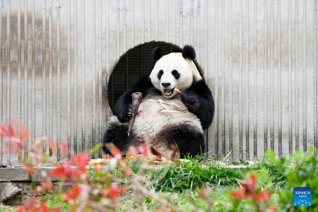 A giant panda eats at Shenshuping base of China Conservation and Research Center for Giant Pandas in Wolong National Nature Reserve, southwest China's Sichuan Province, April 24, 2022. (Xinhua/Xu Bingjie)