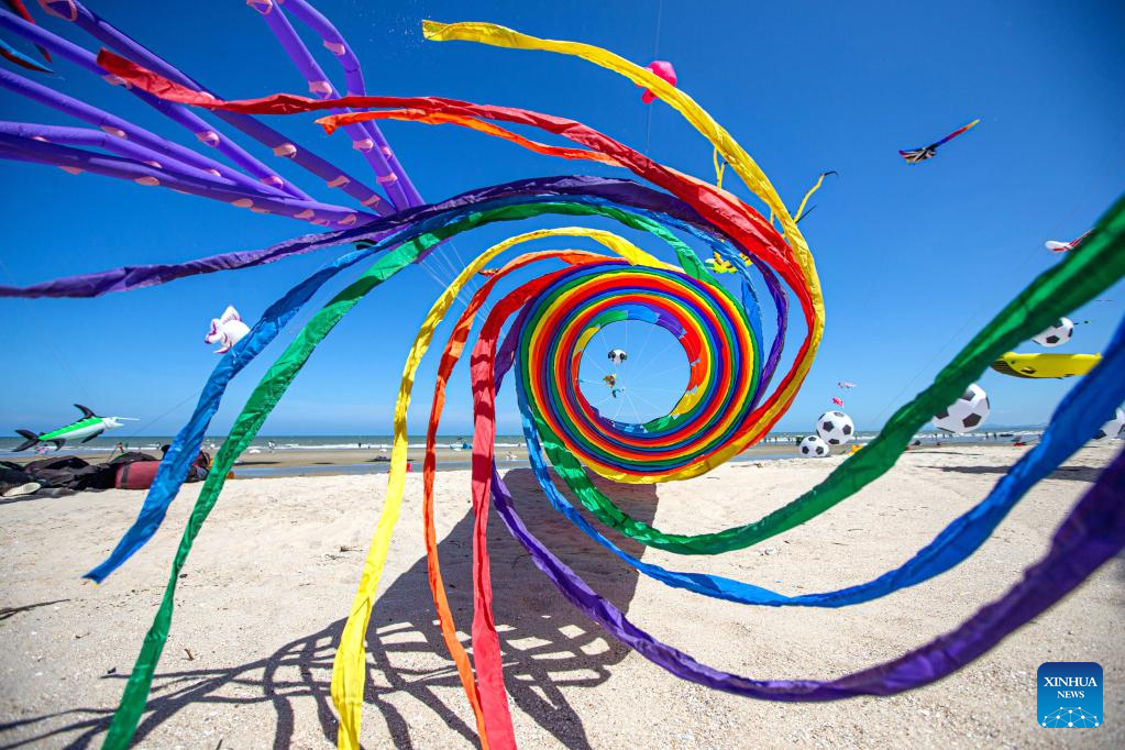 Kites hover above the Cha-am Beach in Phetchaburi, Thailand, on April 23, 2022. Kite enthusiasts and visitors gathered on Saturday at Cha-am Beach in Thailand's southern Phetchaburi province to enjoy the annual international kite festival. (Xinhua/Wang Teng)