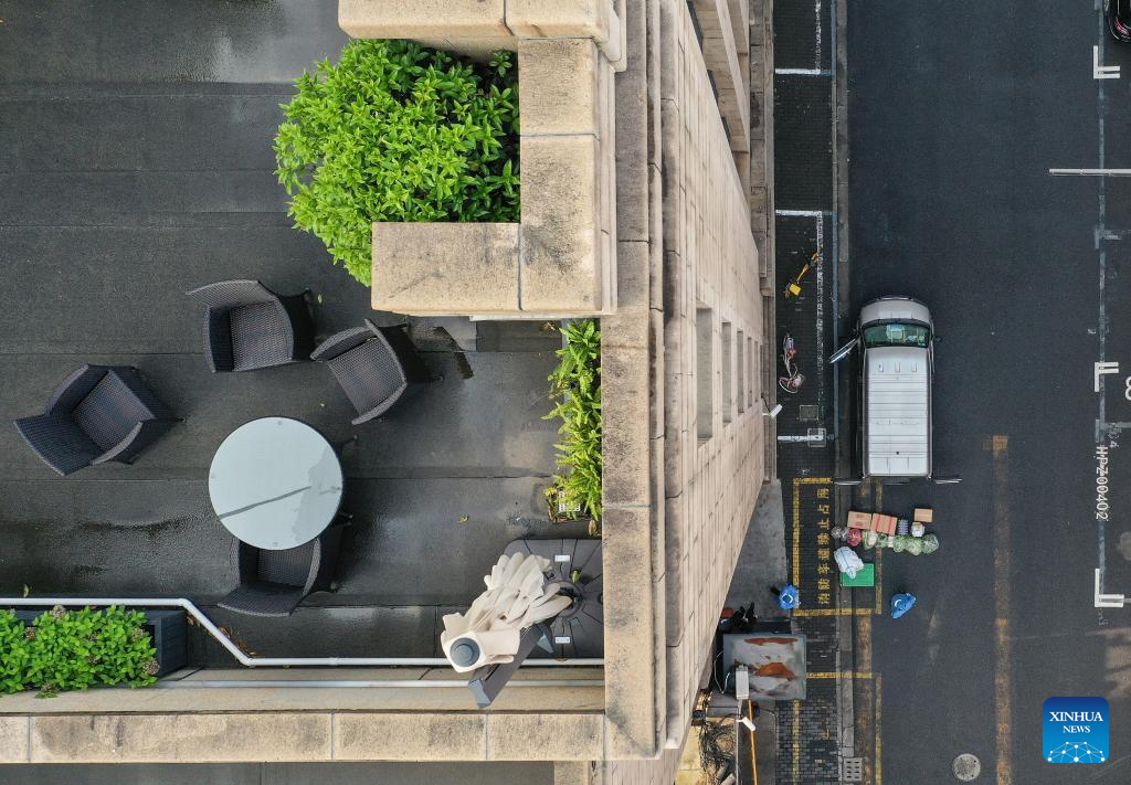 Aerial photo taken on April 21, 2022 shows staff members disinfecting living materials outside a business office of Bank of China in Shanghai, east China.