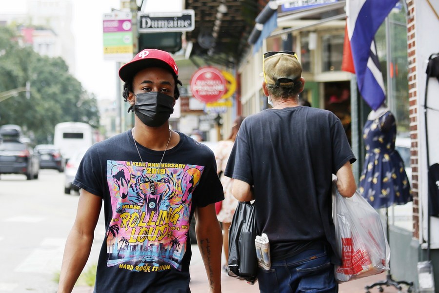 People wearing face masks walk on a street in New Orleans, Louisiana, the United States, on Aug. 3, 2021. (Photo by Lan Wei/Xinhua)