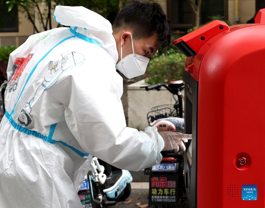A worker arranges packages on a shelf in a community of Jiading District, east China's Shanghai, April 25, 2022. Many communities in Shanghai have been using unmanned delivery vehicles to distribute supplies to residents amid challenges caused by the recent resurgence of COVID-19. (Xinhua/Chen Jianli)