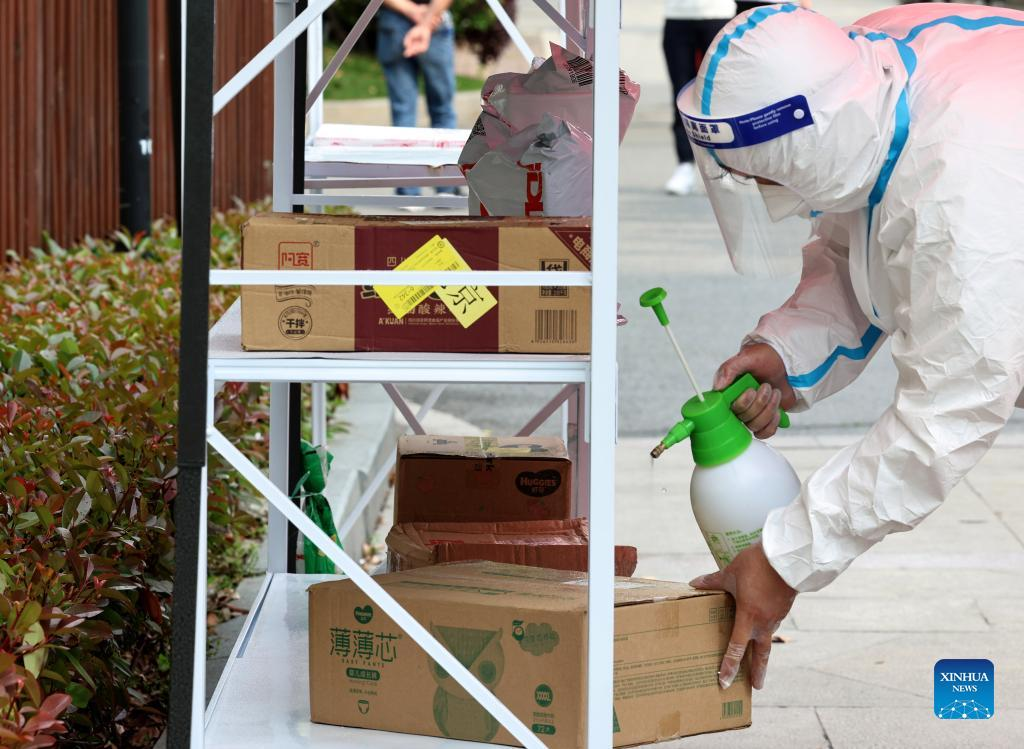 A worker disinfects packages on a shelf in a community of Jiading District, east China's Shanghai, April 25, 2022. Many communities in Shanghai have been using unmanned delivery vehicles to distribute supplies to residents amid challenges caused by the recent resurgence of COVID-19. (Xinhua/Chen Jianli)