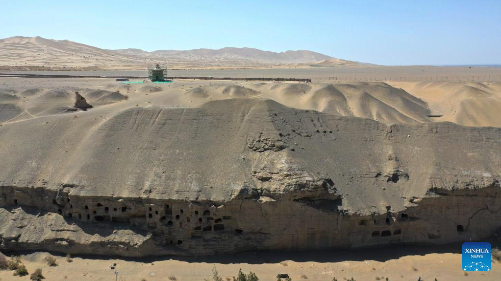 Aerial photo taken on April 18, 2022 shows the Mogao Grottoes in Dunhuang, northwest China's Gansu Province. Located in Dunhuang, northwest China's Gansu Province, the millennium-old Mogao Grottoes are home to a vast collection of Buddhist artworks which are considered one of the finest in existence -- more than 2,000 colored sculptures and 45,000 square meters of murals -- in 735 caves carved along a cliff by ancient worshippers.