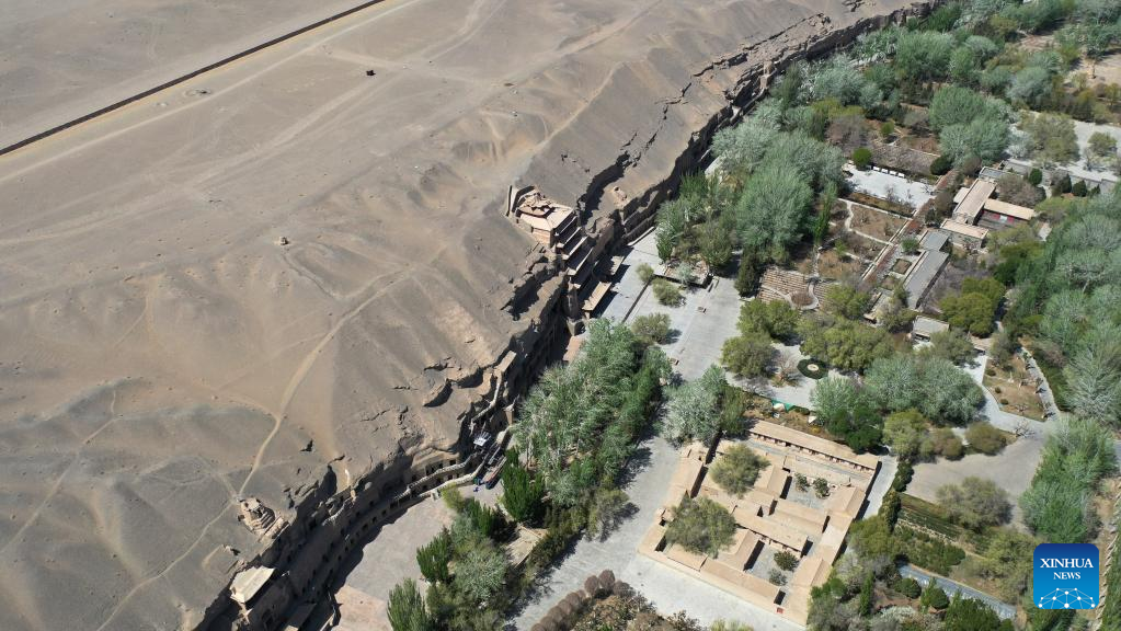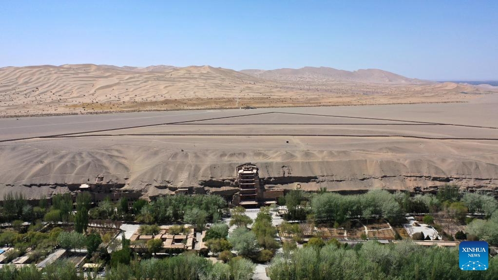 Aerial photo taken on April 19, 2022 shows the Mogao Grottoes in Dunhuang, northwest China's Gansu Province. Located in Dunhuang, northwest China's Gansu Province, the millennium-old Mogao Grottoes are home to a vast collection of Buddhist artworks which are considered the finest in existence -- more than 2,000 colored sculptures and 45,000 square meters of murals -- in 735 caves carved along a cliff by ancient worshippers.