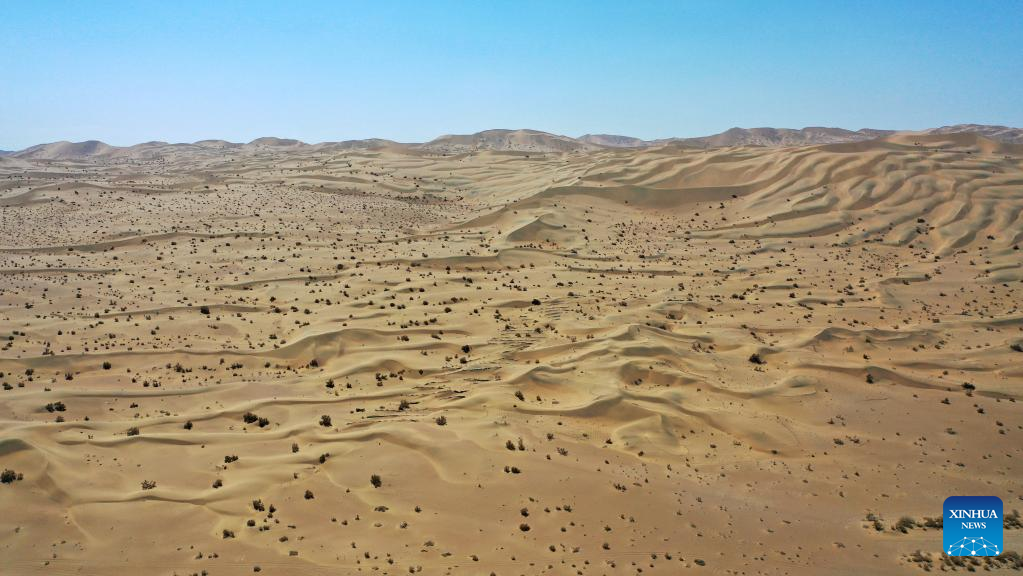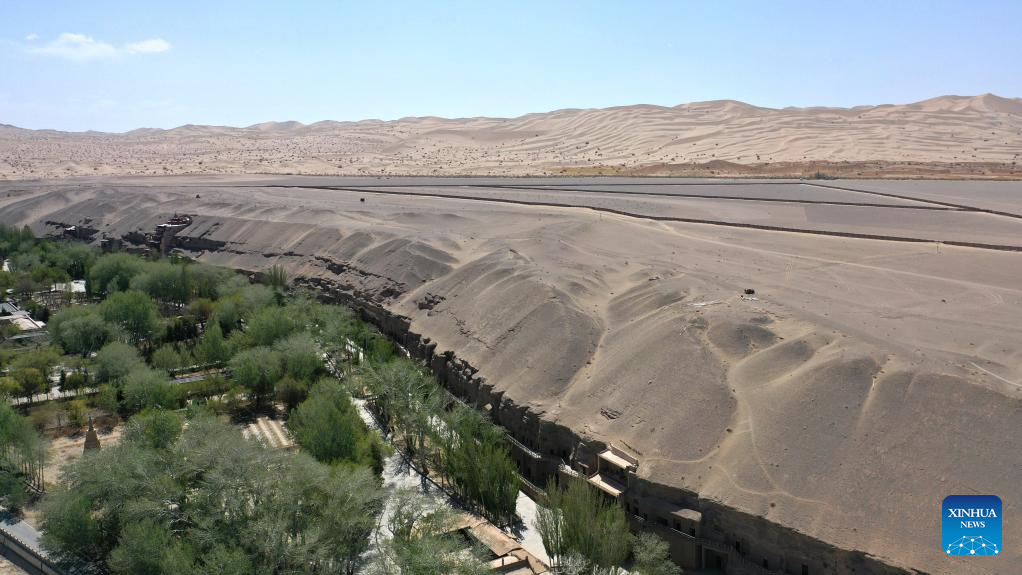 Aerial photo taken on April 18, 2022 shows the desert near the Mogao Grottoes in Dunhuang, northwest China's Gansu Province. Located in Dunhuang, northwest China's Gansu Province, the millennium-old Mogao Grottoes are home to a vast collection of Buddhist artworks which are considered the finest in existence -- more than 2,000 colored sculptures and 45,000 square meters of murals -- in 735 caves carved along a cliff by ancient worshippers.