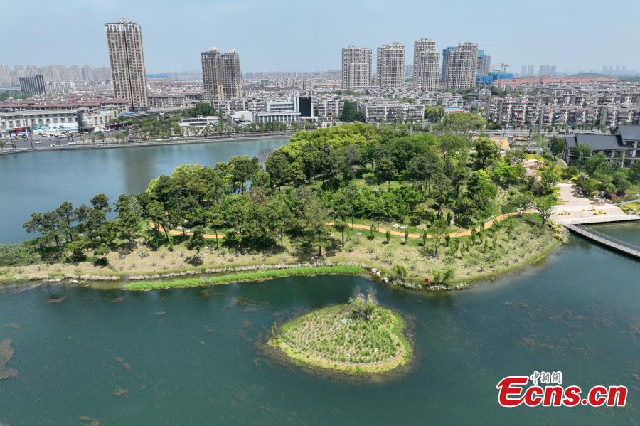 Aerial photo shows a heart-shaped island in Taohu Lake Park, Nanjing, east China's Jiangsu Province, April 24, 2022. The Taohu Lake Park opened to the public in 2021 and was built to protect the water quality of the Yangtze River. (Photo: China News Service/Yang Bo)