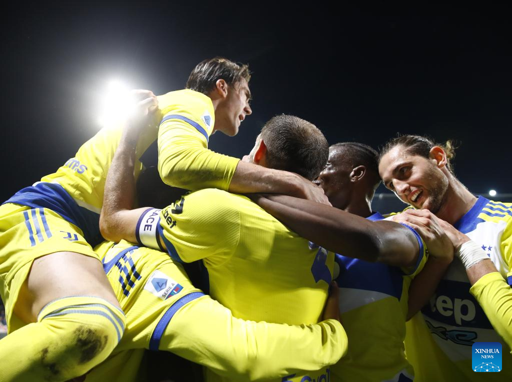 Juventus' players celebrate a goal by Moise Kean during a Serie A football match between Sassuolo and FC Juventus in Reggio Emilia, Italy, on April 25, 2022. (Photo by Federico Tardito/Xinhua)
