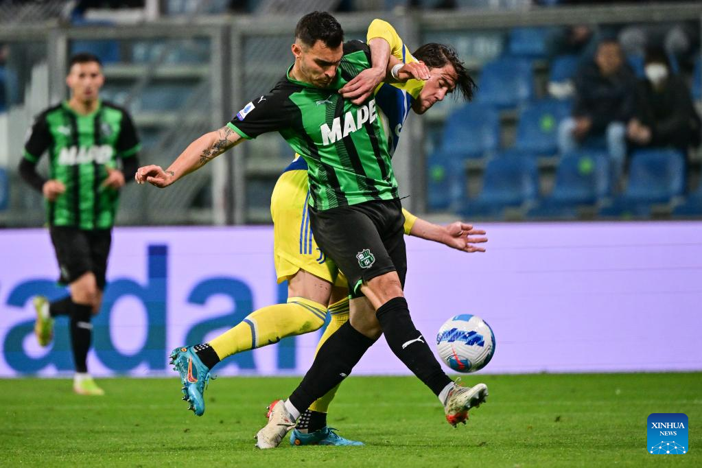 Juventus' Federico Bernardeschi (R) vies with Sassuolo's Maxime Lopez during their Serie A football match in Reggio Emilia, Italy, on April 25, 2022. (Photo by Federico Tardito/Xinhua)