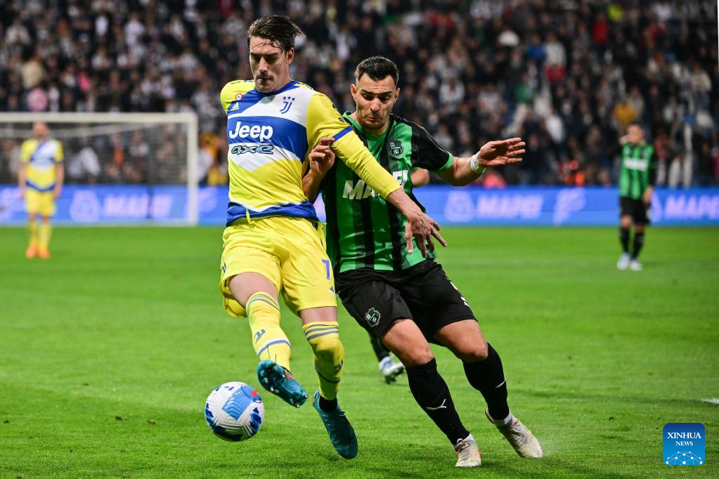 Juventus' Dusan Vlahovic (front L) controls the ball during a Serie A football match between Sassuolo and FC Juventus in Reggio Emilia, Italy, on April 25, 2022. (Photo by Federico Tardito/Xinhua)