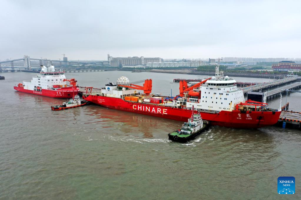 China's research icebreaker Xuelong arrives in east China's Shanghai, on April 26, 2022. China's research icebreaker Xuelong, or Snow Dragon, returned to Shanghai on Tuesday, marking the end of the country's 38th Antarctic expedition. Two icebreakers participated in the 174-day Antarctic expedition, with the Xuelong 2 arriving in Shanghai six days ago. (Polar Research Institute of China/Handout via Xinhua)