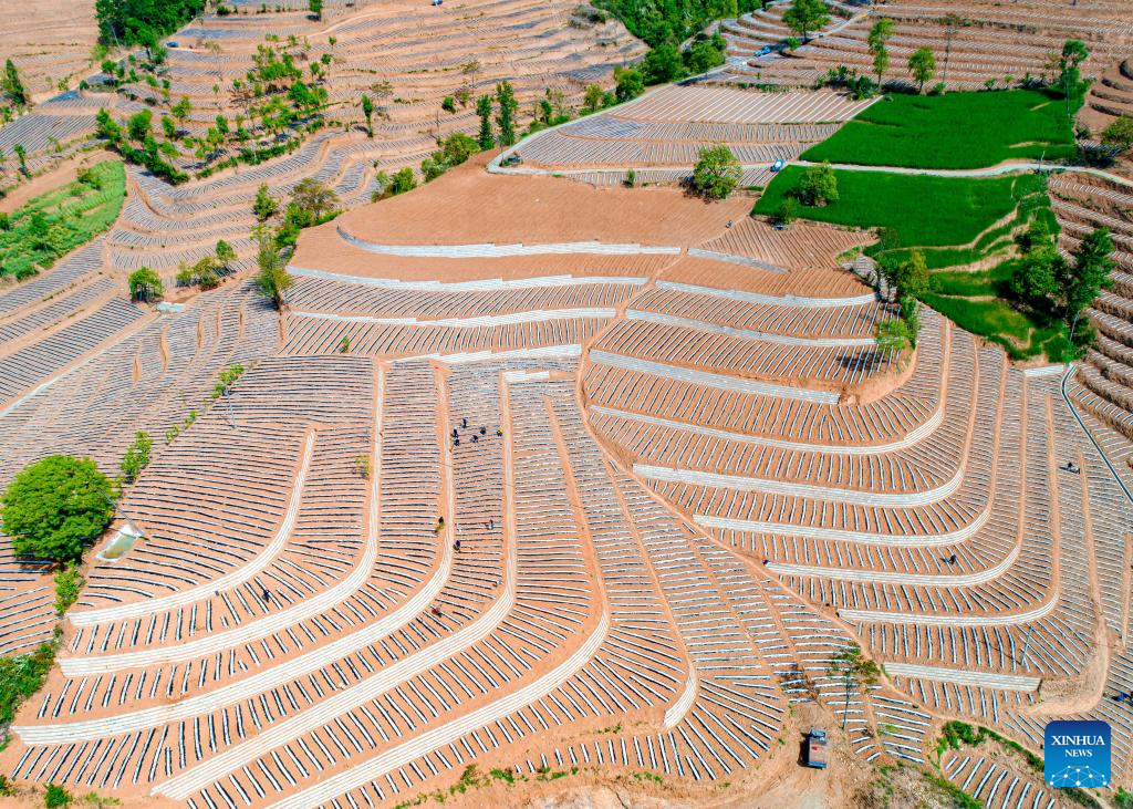 Farmers work in terraced fields in Tanjiazhuang Village of Lueyang County in Hanzhong, northwest China's Shaanxi Province, April 26, 2022. (Photo by Liu Xinhua/Xinhua)