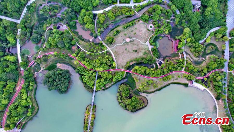 People exercise on the newly-built trail at Zhangjiang National Wetland Park, Ganzhou, east China's Jiangxi Province. Colored trail winding along the lakeshore looks like a red ribbon at the park. (Photo: China News Service/Zhu Haipeng)