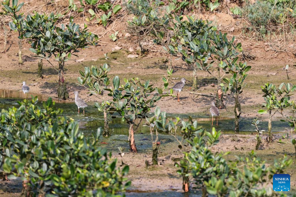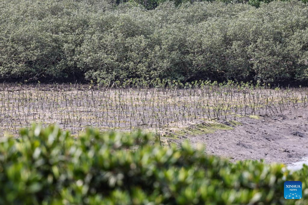 Photo taken on April 27, 2022 shows mangrove seedlings at Dongzhaigang National Nature Reserve, south China's Hainan Province. Dongzhaigang National Nature Reserve, the first wetland nature reserve dominating mangrove forest in China, started to conduct bird diversity monitoring in order to learn the changes and rules of bird population here. (Xinhua/Zhang Liyun)