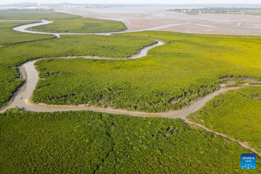 Aerial photo taken on April 27, 2022 shows Dongzhaigang National Nature Reserve, south China's Hainan Province. Dongzhaigang National Nature Reserve, the first wetland nature reserve dominating mangrove forest in China, started to conduct bird diversity monitoring in order to learn the changes and rules of bird population here. (Xinhua/Zhang Liyun)