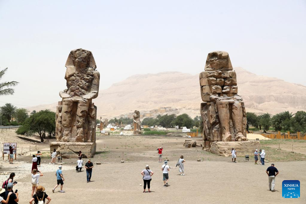 Tourists visit the Colossi of Memnon in Luxor, Egypt, April 26, 2022.