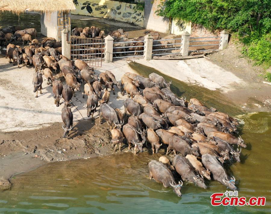 Spectacular view of a herd of buffaloes crossing the Jialing River to forage on Taiyang island, Peng'an county, southwest China's Sichuan Provinc, April 29, 2022. (Photo: China News Service/Liu Yonghong)