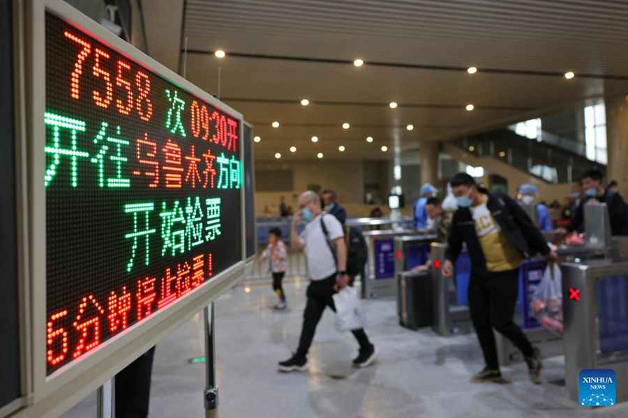Passengers have their tickets checked to board the train 7558 bound for Urumqi in Hotan Railway Station in Hotan, northwest China's Xinjiang Uygur Autonomous Region, April 28, 2022.