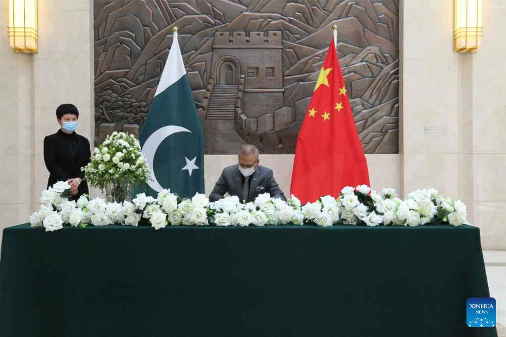 Pakistani President Arif Alvi signs a condolence book for the victims of a terrorist attack at the Chinese Embassy in Islamabad, Pakistan, April 30, 2022. A shuttle passenger van of the Confucius Institute at the University of Karachi was attacked on Tuesday, which has left three Chinese teachers killed. (Xinhua/Jiang Chao)