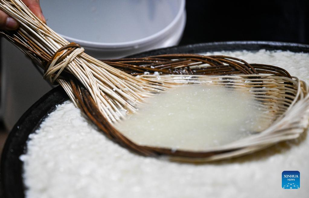 Tao Gao filters whey in Zhenglan Banner of Xilingol League, north China's Inner Mongolia Autonomous Region, April 27, 2022. Tao Gao is the national intangible inheritor of Chagaanyidee (dairy product) in Inner Mongolia. She combines modern techniques with traditional crafts and trains herders in pastoral areas to make dairy products. In recent years, the local government has boosted the development of traditional dairy food industry to increase the income of herdsmen. The average annual sales of dairy food in the whole banner reached about 60 million yuan (about 9 million U.S. dollars) in the past two years. (Xinhua/Lian Zhen)