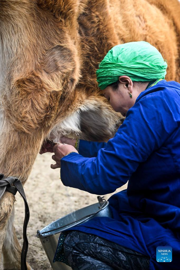 Tao Gao milks a cow in Zhenglan Banner of Xilingol League, north China's Inner Mongolia Autonomous Region, April 27, 2022. Tao Gao is the national intangible inheritor of Chagaanyidee (dairy product) in Inner Mongolia. She combines modern techniques with traditional crafts and trains herders in pastoral areas to make dairy products. In recent years, the local government has boosted the development of traditional dairy food industry to increase the income of herdsmen. The average annual sales of dairy food in the whole banner reached about 60 million yuan (about 9 million U.S. dollars) in the past two years. (Xinhua/Lian Zhen)