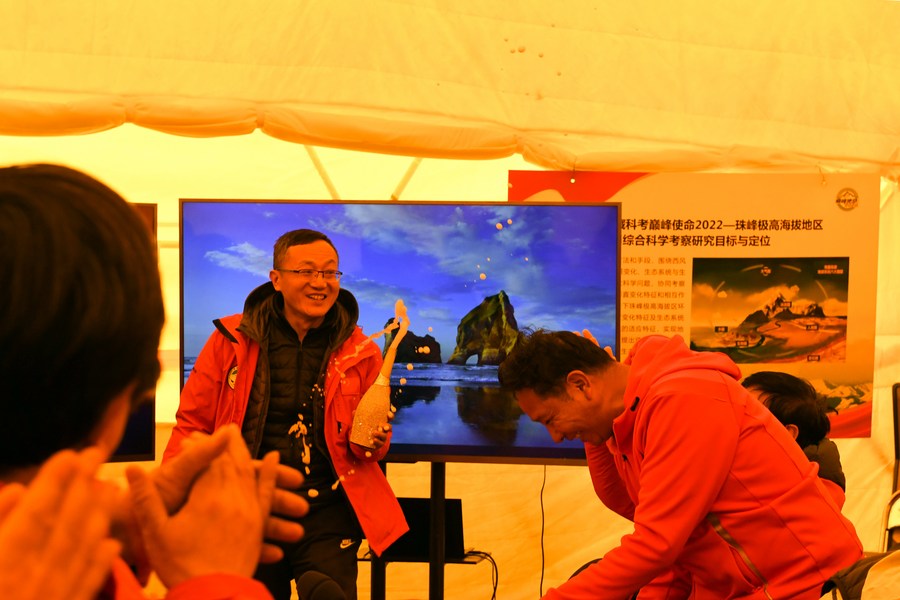 People celebrate at the Mount Qomolangma base camp on May 4, 2022. Chinese scientific researchers reached the summit of Mount Qomolangma Wednesday and established an automatic meteorological monitoring station on it. (Xinhua/Jiang Fan)