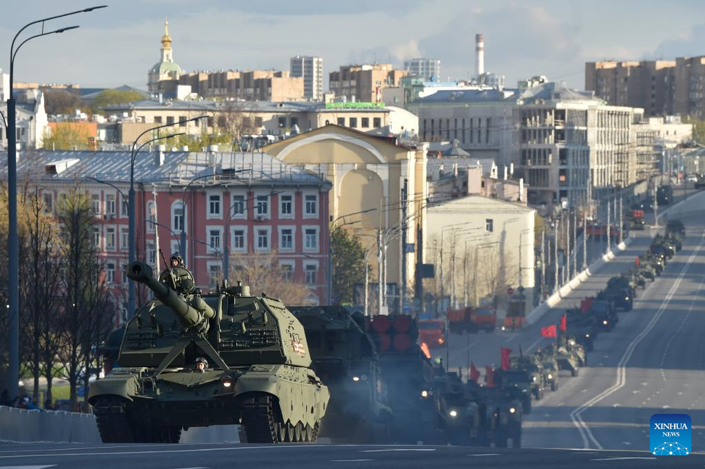 Military vehicles are driven in a rehearsal of the upcoming Victory Day parade in Moscow, Russia, on May 4, 2022. (Photo by Alexander Zemlianichenko Jr/Xinhua)