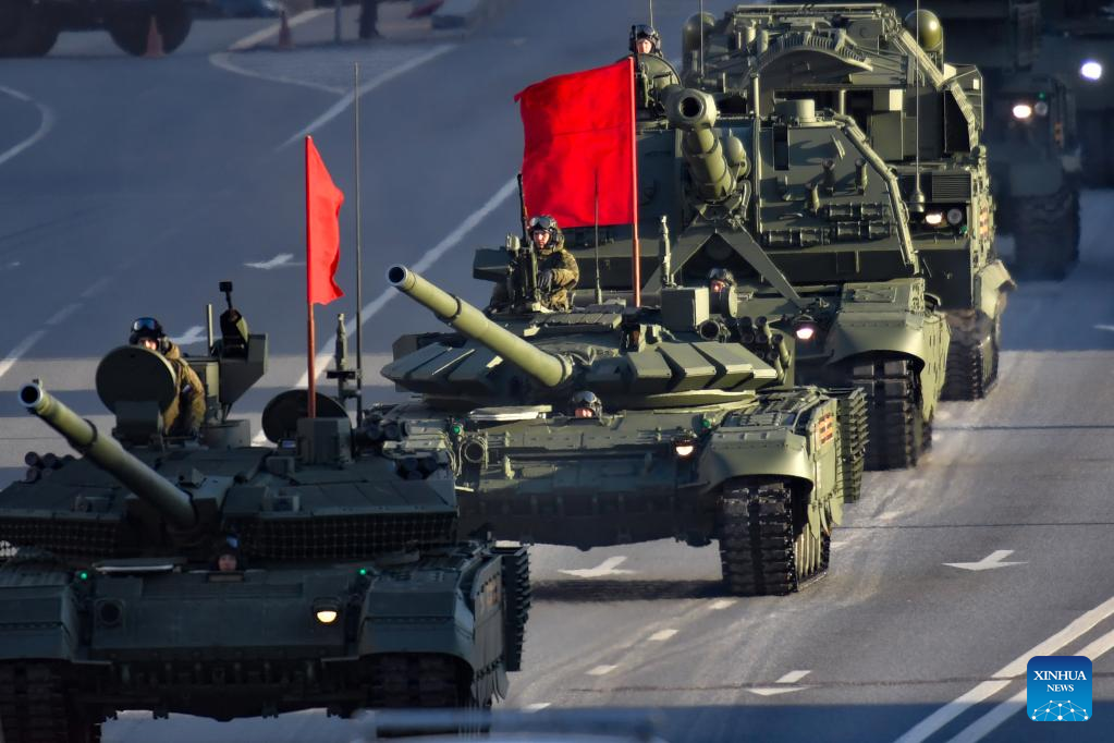 Military vehicles are driven in a rehearsal of the upcoming Victory Day parade in Moscow, Russia, on May 4, 2022. (Photo by Alexander Zemlianichenko Jr/Xinhua)
