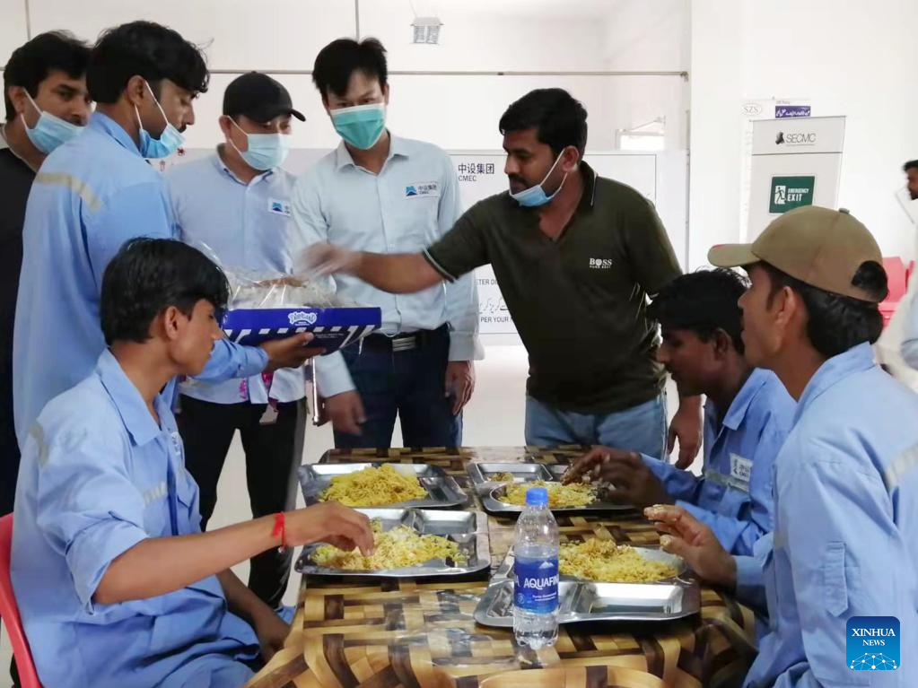 Chinese employees serve lunch to their Pakistani colleagues at China-Pakistan Economic Corridor (CPEC)'s Engro Thar Coal Power Project during Eid al-Fitr in Tharparkar district of the southern Sindh province, Pakistan, on May 3, 2022. The multibillion-U.S. dollar China-Pakistan Economic Corridor (CPEC), a mega project that can help Pakistan overcome its socio-economic challenges, has helped sow the seeds of love among young Pakistanis. (Str/Xinhua)