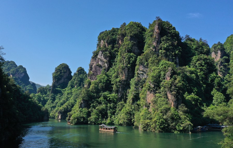 Aerial photo shows tourists taking a boat tour at Baofenghu scenic area in Zhangjiajie, central China's Hunan Province, May 3, 2022. (Photo by Wu Yongbing/Xinhua)