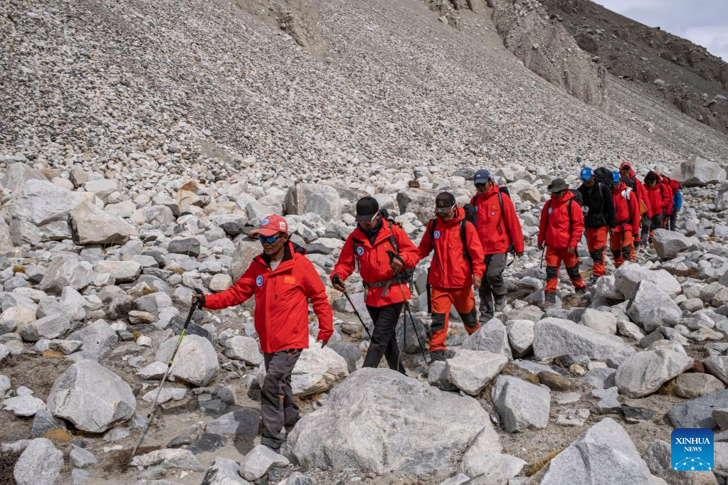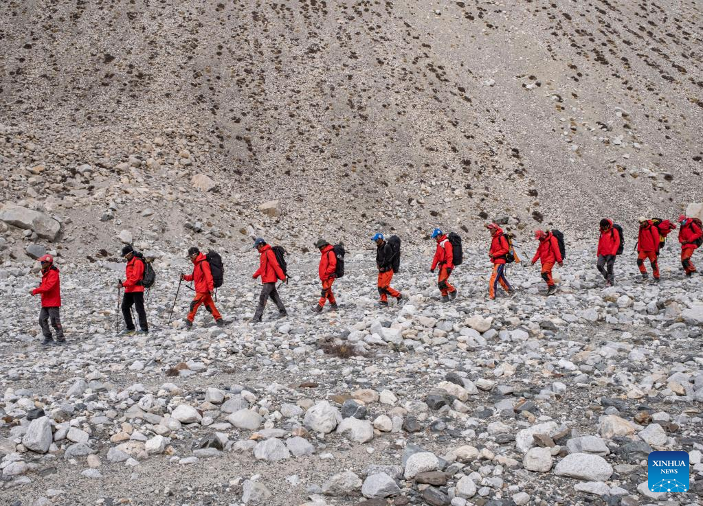 Members of a Chinese scientific expedition team are on the way back to the Mount Qomolangma base camp on May 5, 2022. A Chinese scientific expedition team returned safely to the Mount Qomolangma base camp on Thursday, after reaching the summit of the world's highest peak. All 13 members of the expedition team are in good physical condition. (Xinhua/Sun Fei)