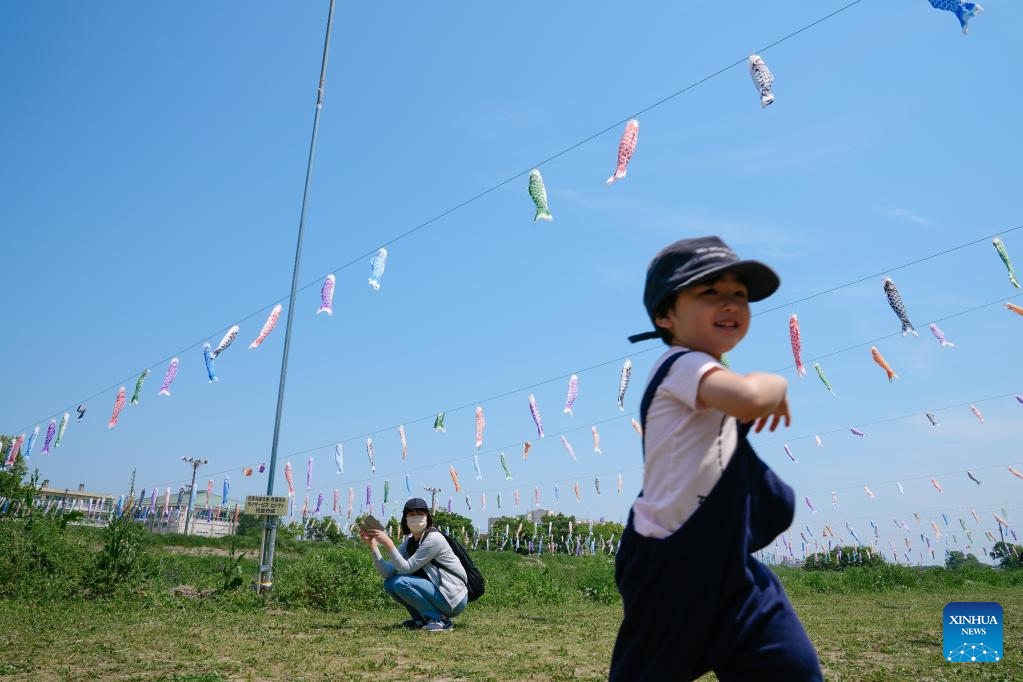 A child plays under carp streamers, known as koinobori, at the Fudobashi of Koshigaya City, Saitama Prefecture in Japan, May 5, 2022. Japan marks its Children's day on May 5, on which families raise the koinobori to pray for happiness for children. (Xinhua/Zhang Xiaoyu)