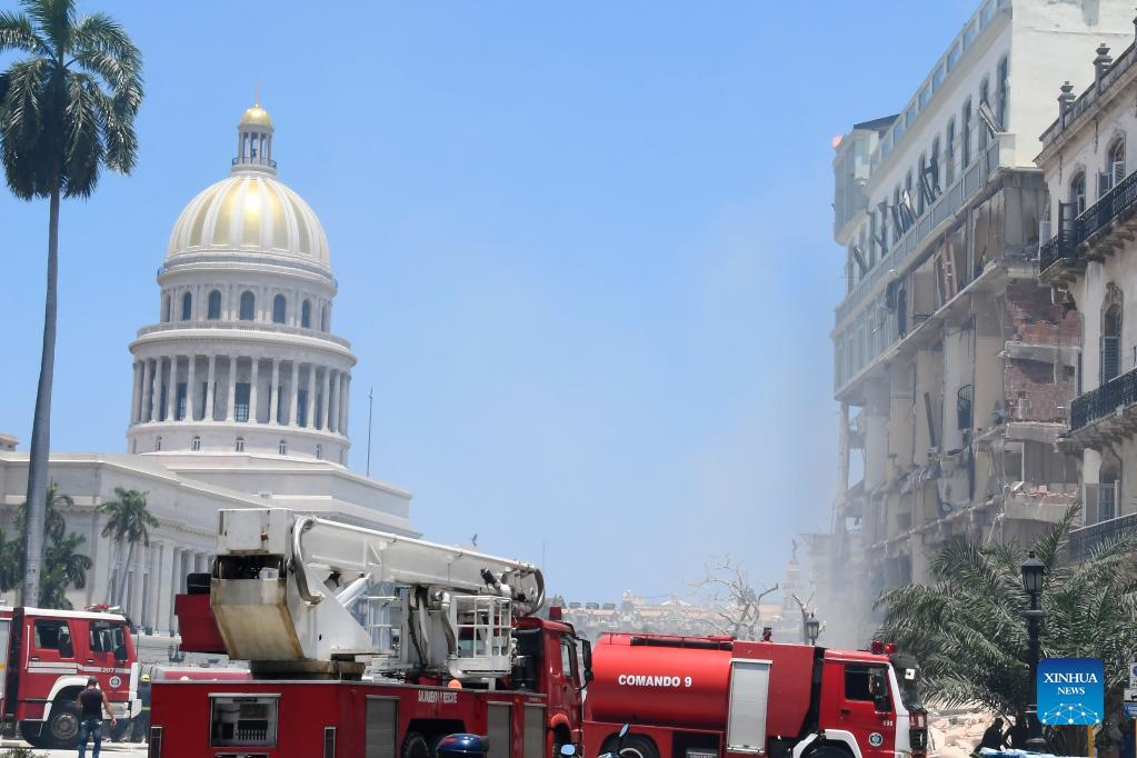 Fire trucks are seen at the site where an explosion occurred at Hotel Saratoga in Havana, Cuba, on May 6, 2022. At least eight people were killed and over 30 others injured after an explosion ripped through the hotel in downtown Havana Friday morning, official sources reported. (Photo by Joaquin Hernandez/Xinhua)