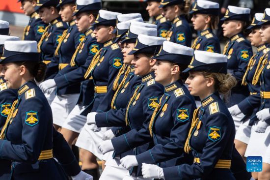 Servicewomen take part in a rehearsal of the Victory Day parade in Moscow, Russia, May 7, 2022. (Xinhua/Bai Xueqi)