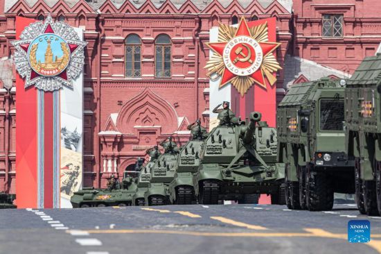 Msta-S self-propelled howitzers take part in a rehearsal of the Victory Day parade in Moscow, Russia, May 7, 2022. (Xinhua/Bai Xueqi)