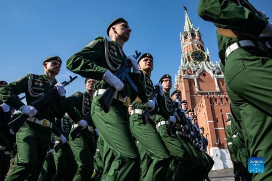 Servicemen take part in a rehearsal of the Victory Day parade in Moscow, Russia, May 7, 2022. (Xinhua/Bai Xueqi)